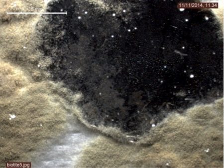 Picture taken with a stereoscopic microscope showing one of the fungi (white-yellow mass) colonizing a mica flake (black).